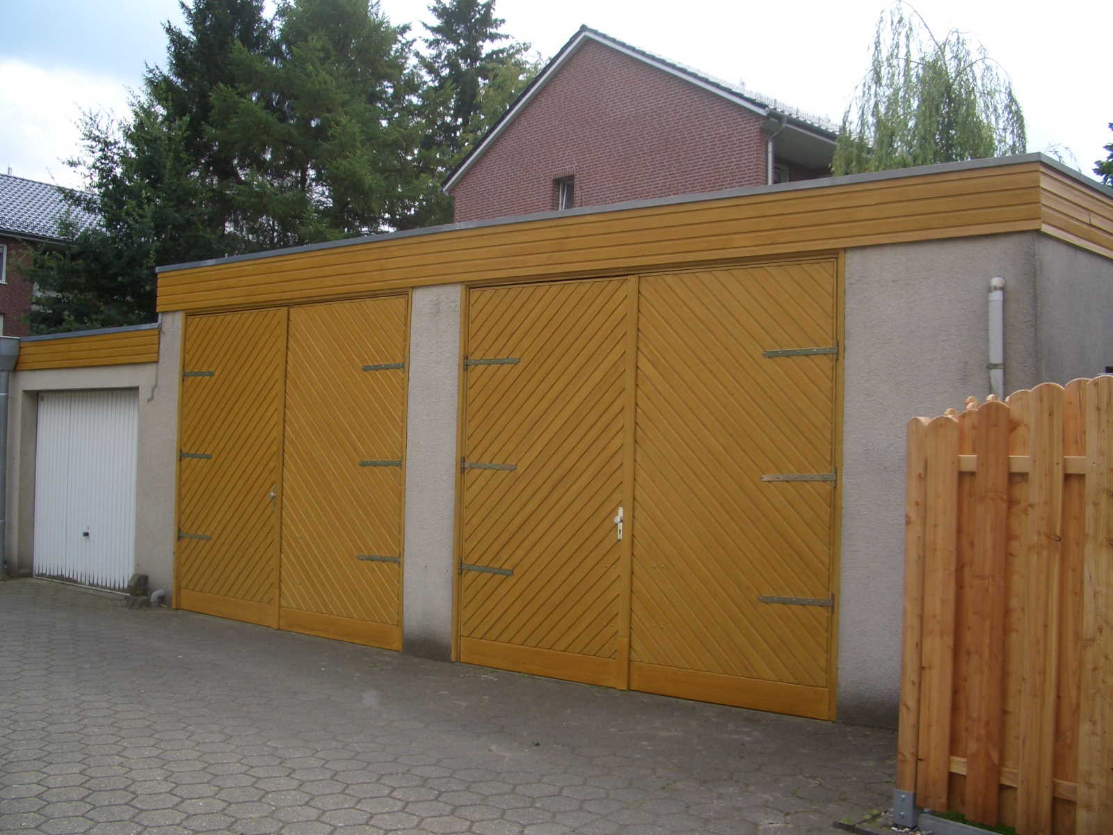 Bei dieser Garagenanlage sind die Holzflächen der Attika und der Garagentore durch Witterungseinflüsse grau und unansehnlich geworden.